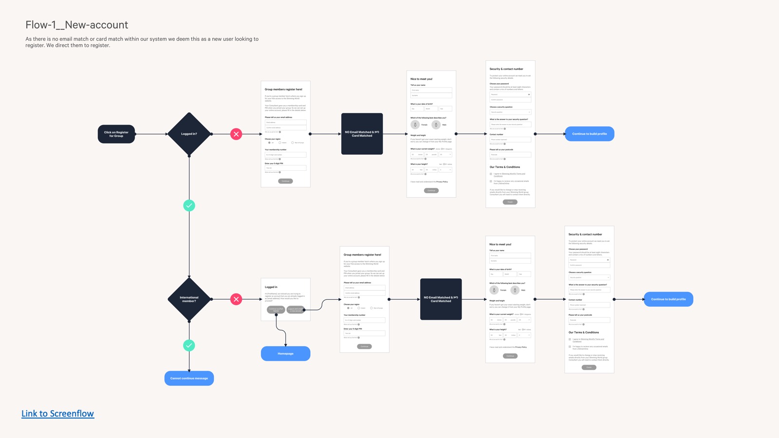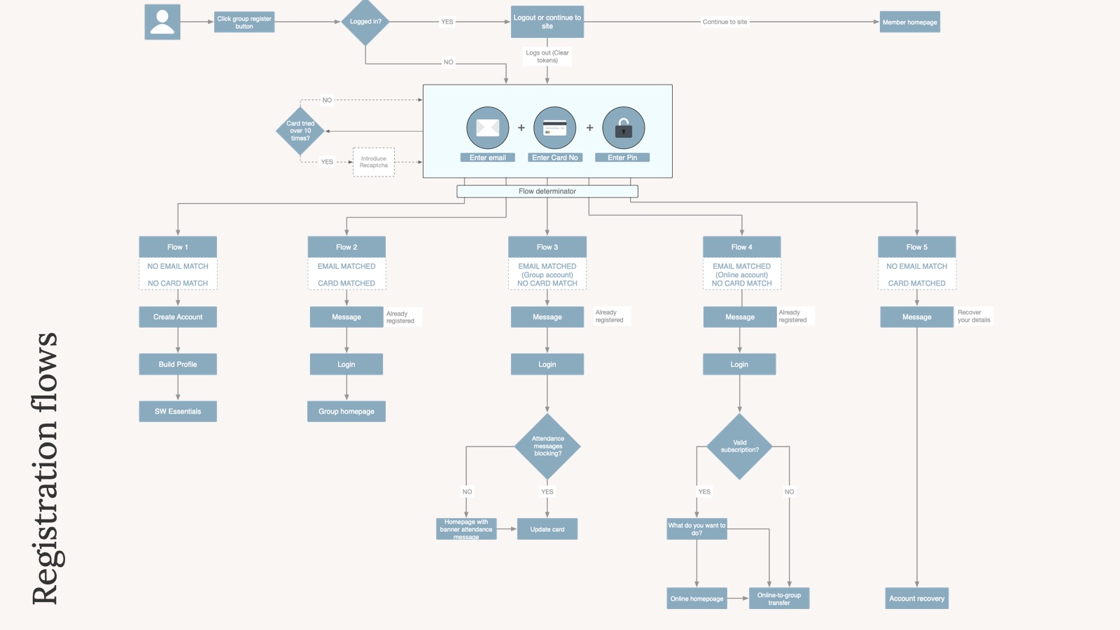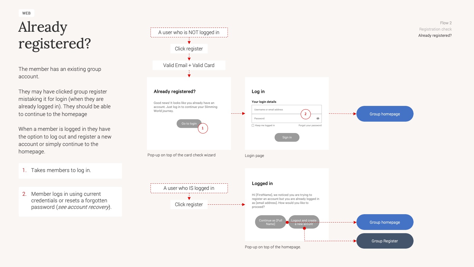 A big part of my initial work involved mapping and documenting current-as-is journeys for our Online members who were currently using the platform. This gave us a starting point to go on and understand how these flows would need adapting to handle Group members. I setup meetings with product owners and stakeholders to run through the current-as-is flows, to confirm accuracy, as well as ideas on how Group adaptations could fit in. These meetings also took place with the wider digital team to gain understanding of business and technical constraints, which in turn helped me develop the initial concepts.
